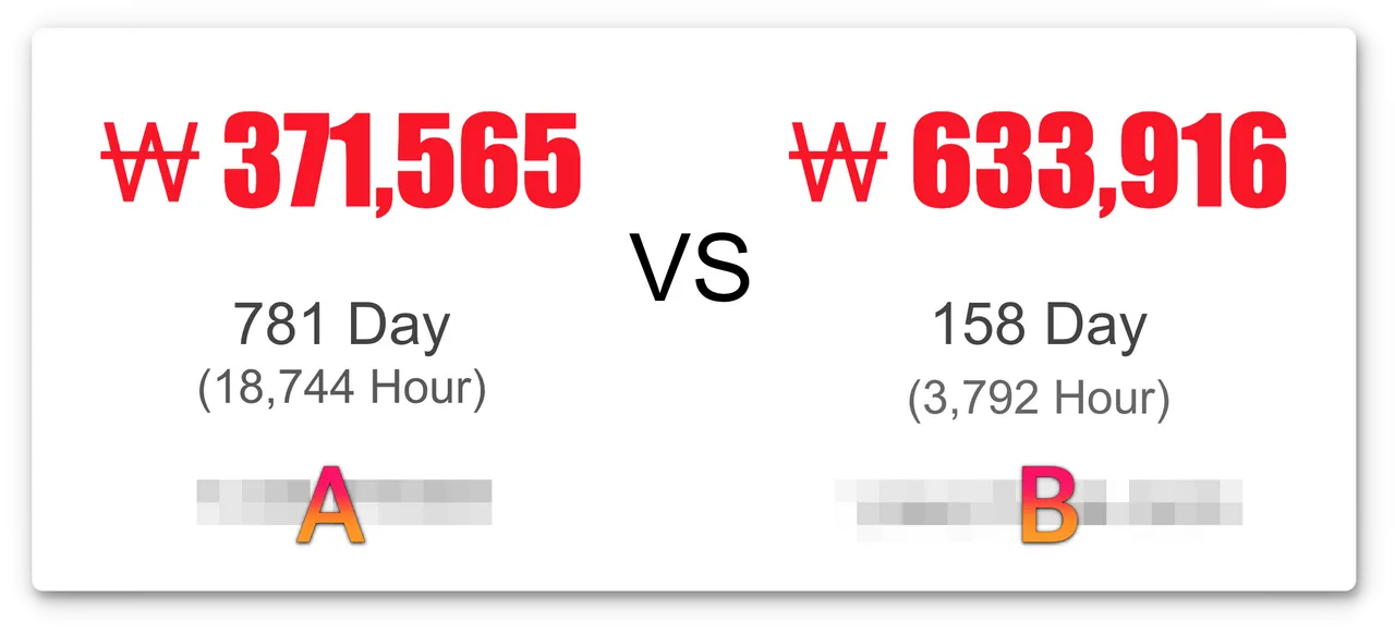 투자시간이 4배가 넘지만 수익은 역으로 2배나 차이가 납니다.ㅜㅜ