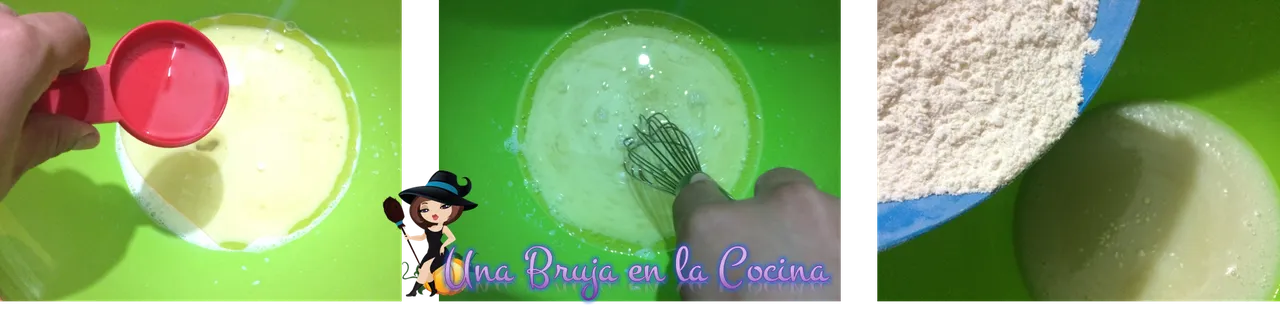 Para comenzar agregamos en un tazón la leche, seguido del aceite y el azúcar, la vainilla y batimos muy bien con ayuda de un globo batidor, hasta que logremos emulsionar bien todos los ingredientes húmedos.