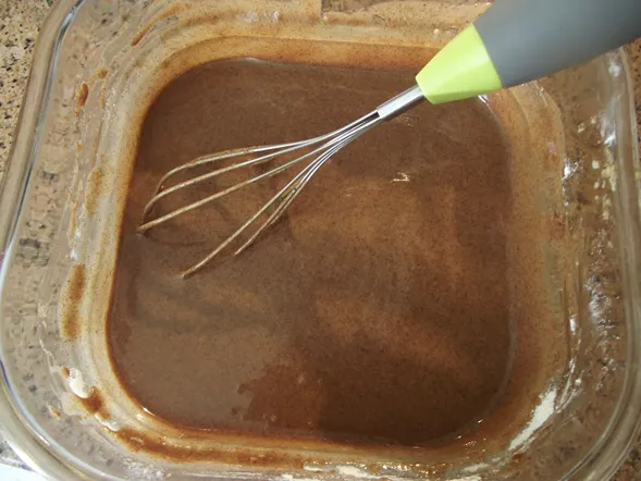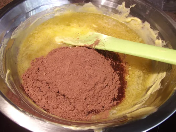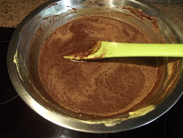 Derretimos la mantequilla a baño maria, cuando este derretida añadimos el Cacao en polvo y el agua.