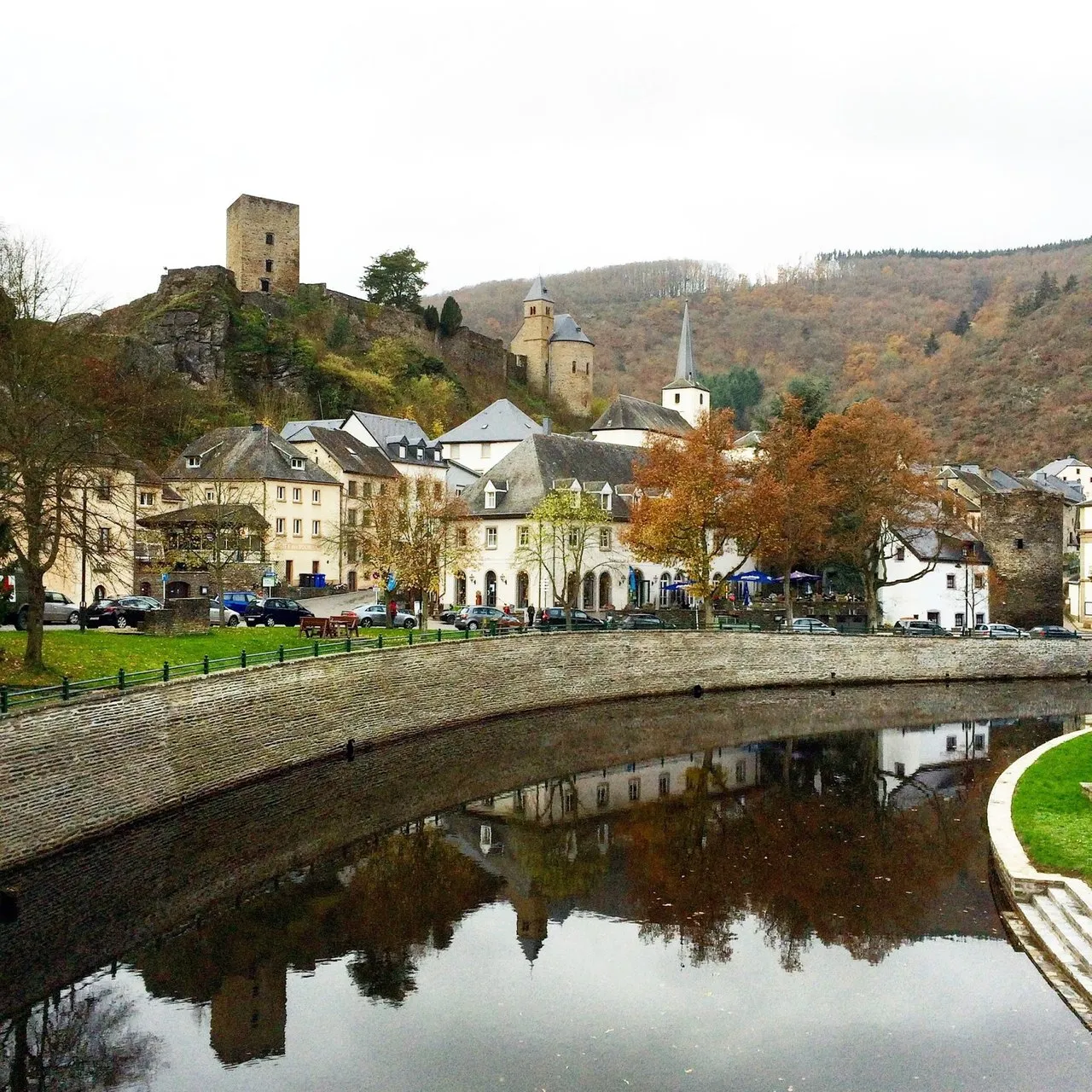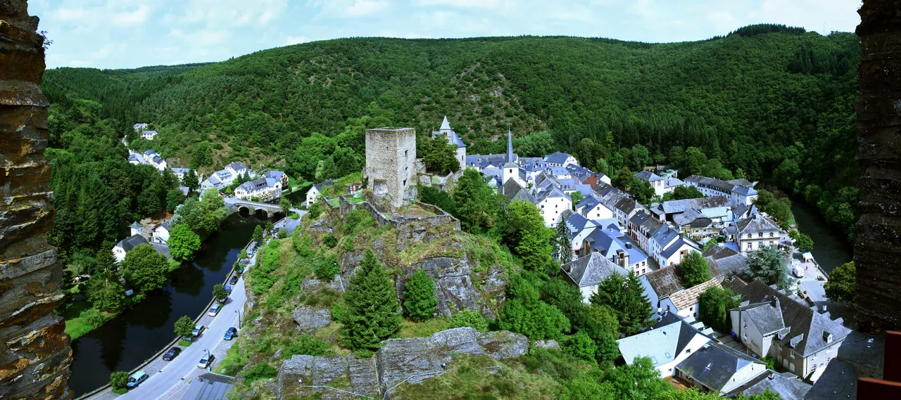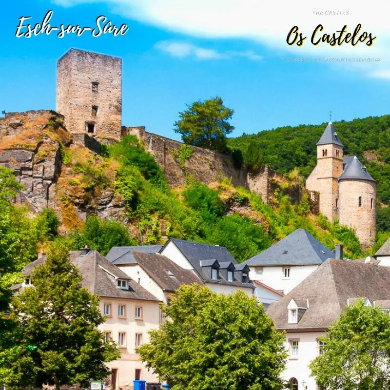 "O Castelo de Esch-sur-Sûre, agora uma ruína, está localizado em um esporão na pequena cidade de Esch-sur-Sûre, no noroeste de Luxemburgo. É naturalmente protegido por um estreito meandro no rio Sûre, que circunda a cidade e o castelo em três lados."