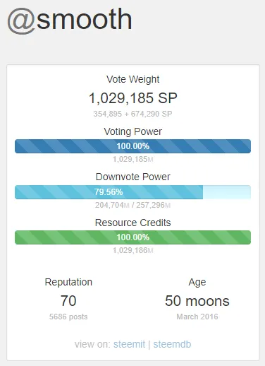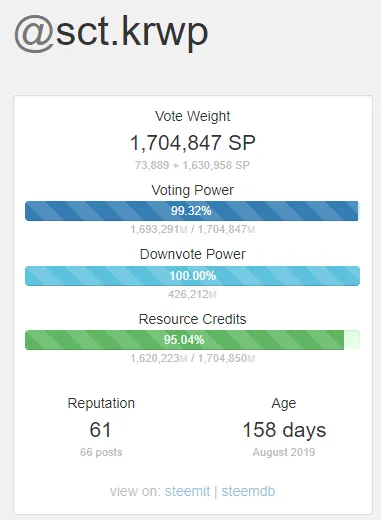 @sct.krwp 계정의 스팀파워는 1,704,847 이고 @smooth 계정의 파워는 1,029,185 입니다. 1:0.6의 비율입니다.