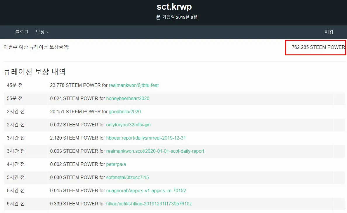 예로든 2 계정의 큐레이션 수익을 살펴보겠습니다.