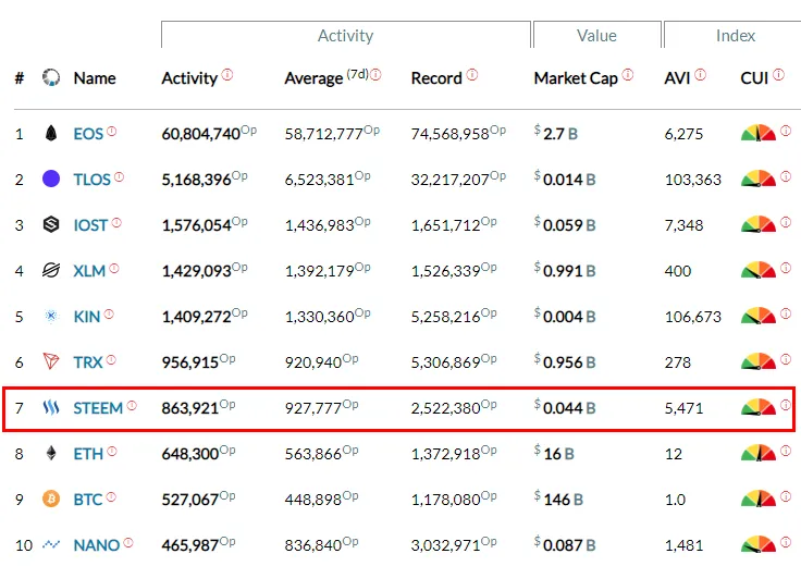 https://blocktivity.info/ 에서 늘상 1위를 하던 스팀은 어느덧 7위로 밀려난 상태입니다. 스팀트랜젝션은 포스팅보다는 업보팅에서 주로 발생하는데 21하드포크는 업보팅 횟수를 줄이도록 권장하기 때문입니다.