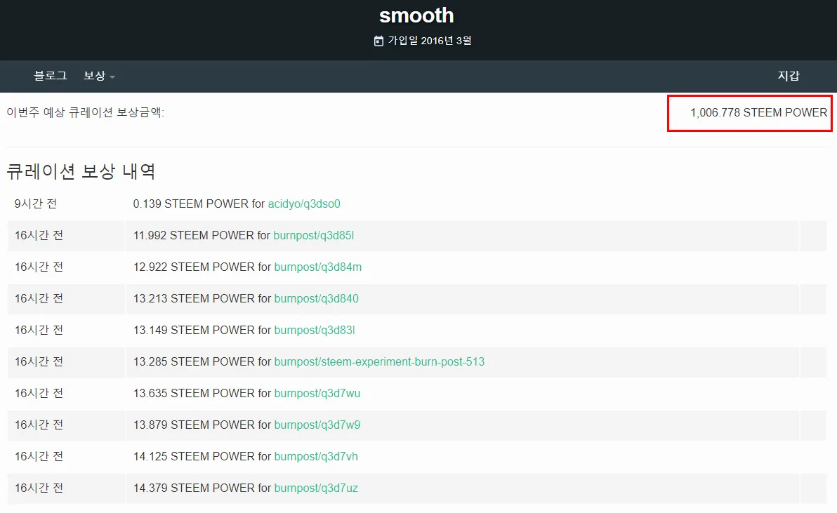 스팀파워는 40%나 적은 @smooth 계정의 큐레이션 수익이 @sct.krwp 계정보다 32%나 많습니다. 더 문제는 @sct.krwp 계정이 @smooth 계정보다 월등히 많은 글에 업보팅을 하고 있다는 것입니다.
