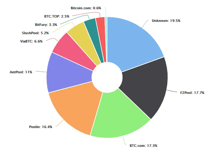 세계 최대 디지털 자산 채굴기 생산업체 Bitmain을 필두로하여 블럭체인 닷컴의 데이터 자료에 따르면 중국의 F2pool이 17.7%, BTC닷컴이 17.3%, poolin, Antipool이 각각 16.4%와 11%의 점유율을 기록하고 있고 5위권 역시 ViaBTC로 이 모든업체들이 중국업체들이다