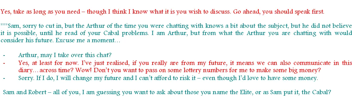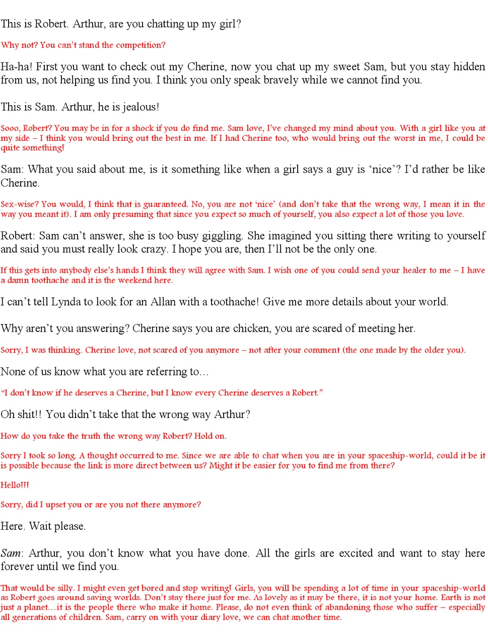 As I was saying before Arthur cut in, we all know Robbie well enough to guess his mention of Arthur and Allan was his way of changing the subject - though he does not usually use a problem that worries us to do so. We were all willing to let it go until we are alone, but Lucy was too caught up in her own worry and nearly spoke out. Theresa sharply rebuked her directly in her mind and she stayed silent, her mutinous feelings still evident though. Hoping to defuse the situation I asked him, Are you going to let him die? but he did not answer, just his eyes showing me he was annoyed by my question. While other things were discussed I thought about it, wondering what had got into him. Luckily Aganthi took pity on me.