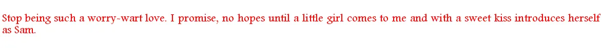 “That’s alright love. Sam, I do not expect you to think of everything, just as you do not expect it of me.” His eyes had a sudden evil look to them and I knew something had amused him. “In his time, since he began writing, how long? Two years? In our time? About eighteen to twenty? Sam, how would you like to drive him crazy?” I did not dignify his question by responding; I knew it would not be something I would do. “What if you wrote a page every day?”