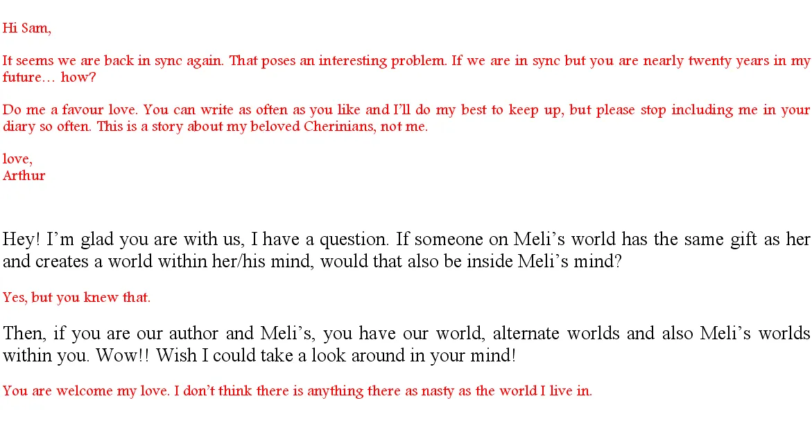 “Not for Arthur. I had not thought of this before. Whatever the ratio is between his world and ours, it does not exclude the time we spend elsewhere. If I am not correct, how is it he can communicate with us when we are travelling in our spaceship-world?”