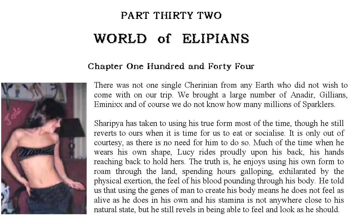 A delicate point I should not mention, but it is a bit funny, in a way. When Sharipya is projecting as a man, he always wears clothes and I believe he would even be embarrassed to be seen without anything on. And yet, when he is with us as an Elipian, there is no sense of modesty. None of us girls, not even Lucy, would be rude enough to stare at what can be seen of his Elipian penis and so on, so hopefully the subject will never be mentioned.