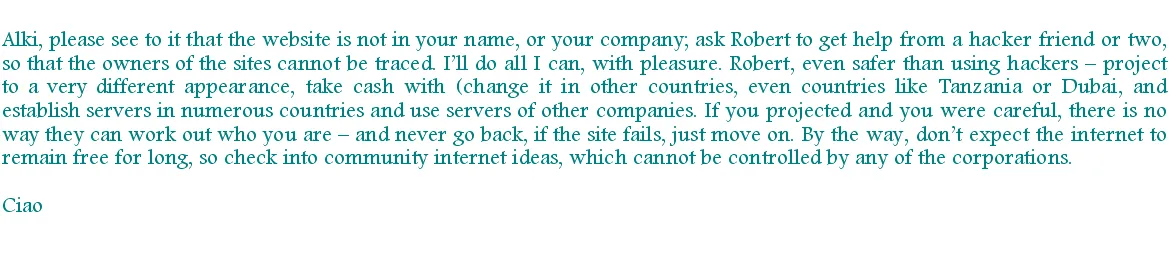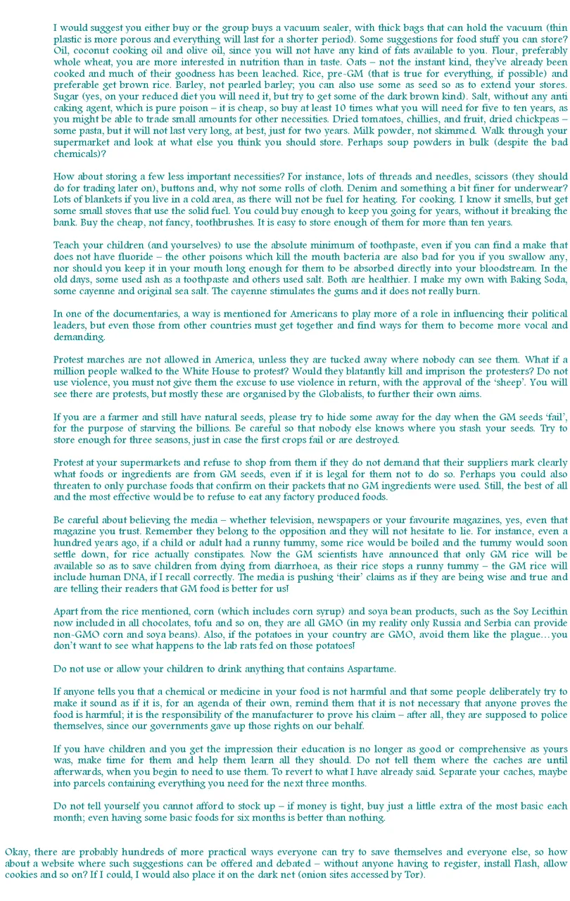 I told him that you have some practical ideas and we should work together to save everyone we can. Arthur, please add any other ideas you have, for us to pass on to the Normals – and I will see to the kind of site you mentioned being opened, on various servers all over the world and in as many languages as possible, so that many can add their own suggestions.