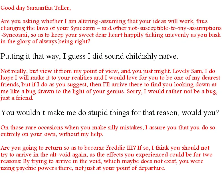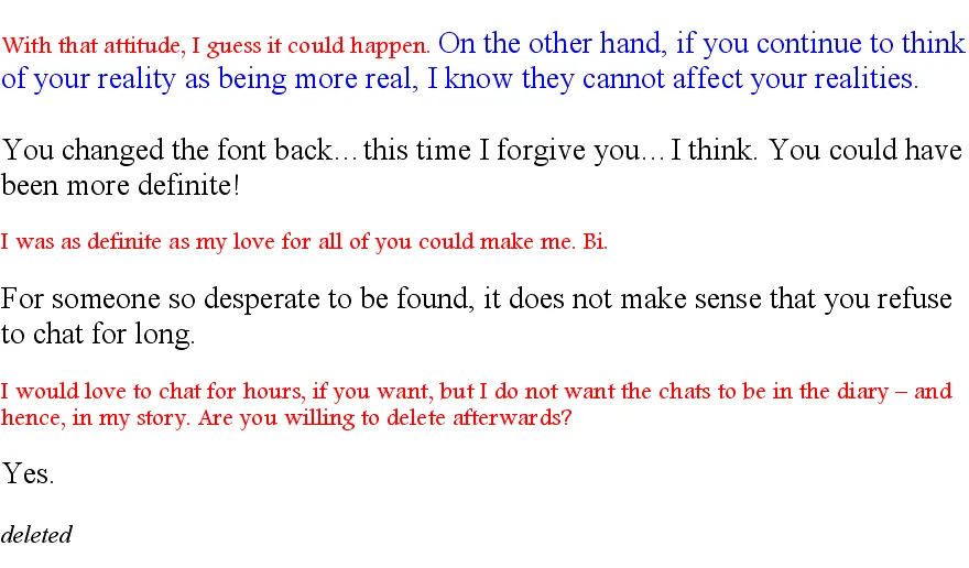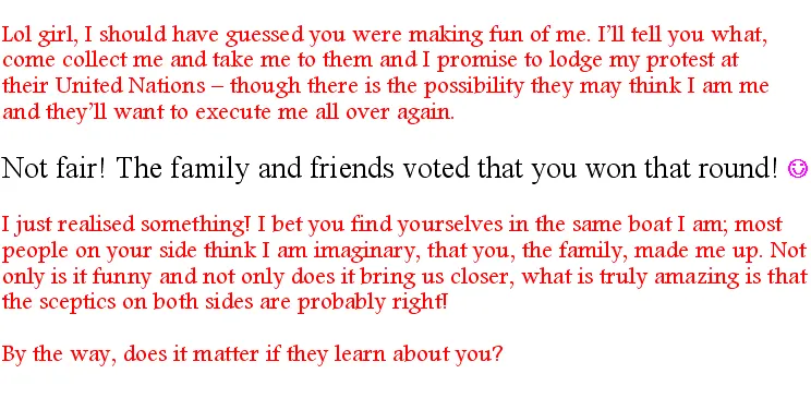 I’d wondered, just briefly, whether the reality we tried to visit rejected us because of Gilli - I mean, to that reality we are just an imaginary reality, so Gilli comes from an imaginary reality of an imaginary reality. Robbie did not bother remarking on my thought, for he has grown good at sensing which thoughts of mine he should take seriously - though I can, with some effort, bluff him when I want to tease…maybe he is allowing me to bluff him? I hope not, as I’d have to stop my teasing; I’m not like Cherine, when I win, I want to know that I really did win. (Cherine: What are you trying to say Sam?) Me? Nothing…I wouldn’t dare! Ask Goldi, she’ll confirm what I said.