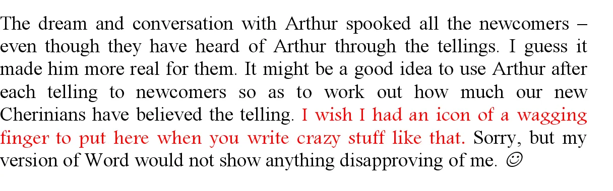 The teasing came about because we were happy - not that Robbie approved of what we said, even if it was in fun. As for the Mansfields, seeing each other in their original bodies, as they’d seen happen to their alternates, smashed through the hardness they have acquired over the centuries and they are now ready to become Cherinians - well, almost. I’ll know it is time when I see Cherine sit on the lap of Hettie.