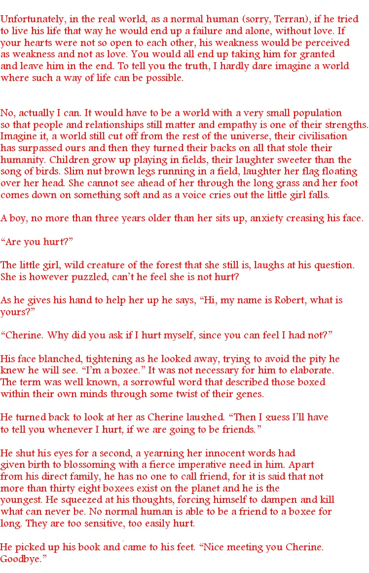 “No.” It was a shock and I was excited. “Bernie, I had not realised. When I thought I had forever to live it made me afraid - to lose it will be so terrible. Now that I know I’ll die, I’m not so afraid anymore. What can be worse than losing you all forever?” I was so involved in my own excitement at my discovery I did not pause to think of the effect of my words on her and of course on all the others (not such a great Cherinian after all, am I?). Bernie went white as a sheet and then crying hugged my neck tightly, pleading with me not to die. Helplessly I held on to her and as I saw the sorrow in all the faces around me I also began to cry. Robbie looked on helplessly while friends wondered what the hell was going on.