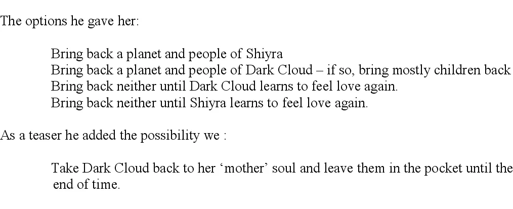 We first returned to the reality of Shiyra’s ‘mother’ soul, Robbie released the stasis and allowed a part of her to enter and show them all that has occurred and ask for clear directions to the solar systems occupied by Dark Cloud’s people. When the soul part from Shiyra returned, we saw Shiyra is worried.
