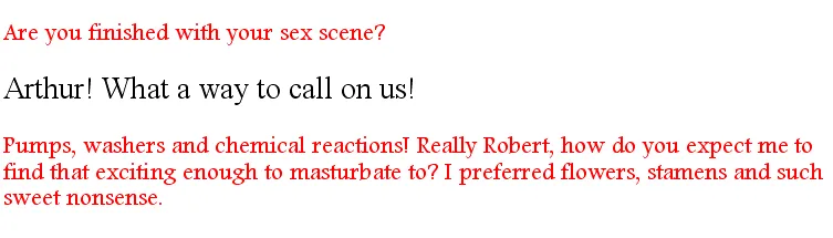 “Apology accepted Robert. Cherine did not upset me in the sense you mean. It was interesting feeling what it is like for your species. I am curious though, is it the way of your species that those of the same sex pleasure each other? At times I thought Sam was going to die from too much happiness.”