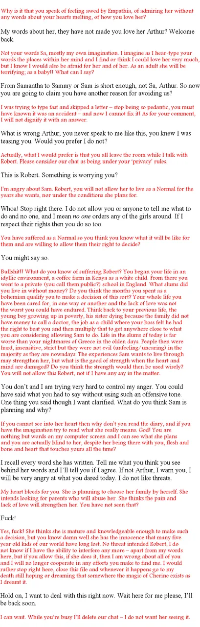 “Cherine, we see a change in Empathia. She is different from the other children. Gina is perhaps closest to the way she is. What about young Richard, that sweetness of his? We have come to the conclusion that children conceived or who spent most of their time in the womb on Freddie are altered. Do either of you have a reason for it?”