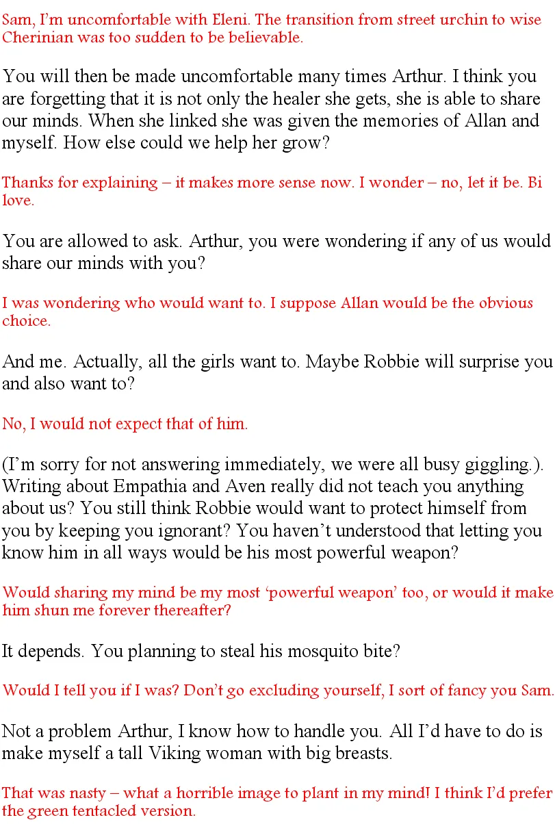 “It is better if you make your choices honestly.” Robbie grinned. “Not strictly true. We might be linking Aven and I was worried you, Eleni and Jessie might feel hurt we linked her before Jessie.”