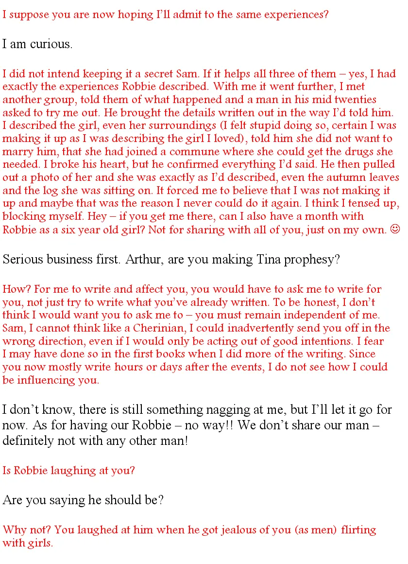 I dismissed the wonder (for the moment) as I will ask Arthur when I write of it. “Tina, Robert was trying to tell you something about the way you feel when you prophesy.”