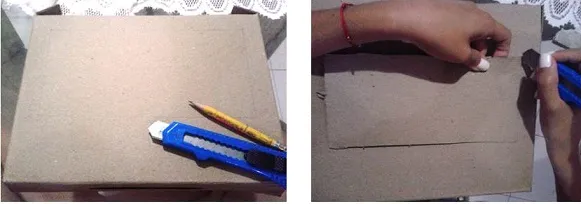 Lo primero que hice ajustar la caja a la medida que quería, la corté con una tijera a un poco más de la mitad, luego tracé un rectángulo en el medio y lo corté con el exacto.
