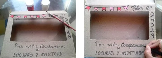 Decoré la parte externa con un bonito mensaje y figuras alusivas al cumpleaños, agregando el toque de color con las temperas.
