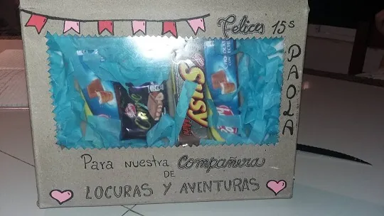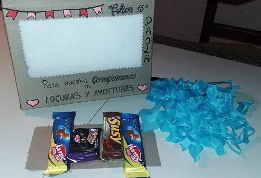 Los materiales que utilicé fueron una caja de cartón reciclada (de esas donde vienen las resmas de carpetas), un exacto, tijera, marcador negro, tempera, silicón, una lámina de acetato y lo más importante, los dulces.