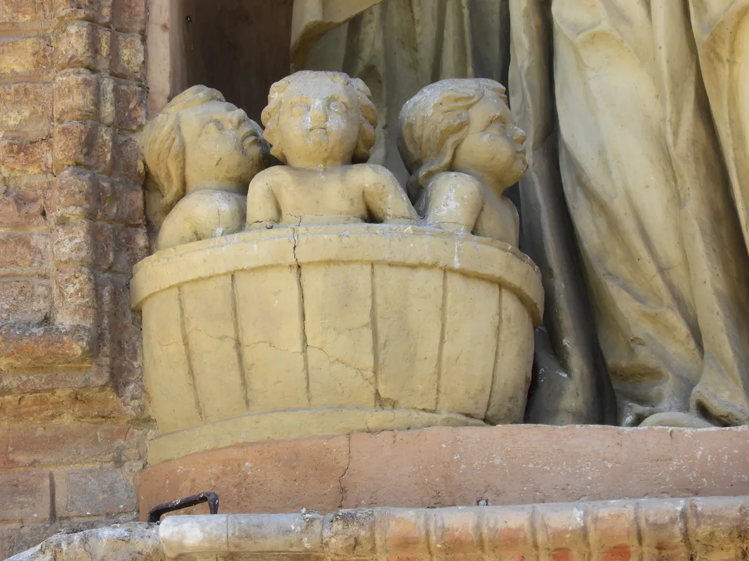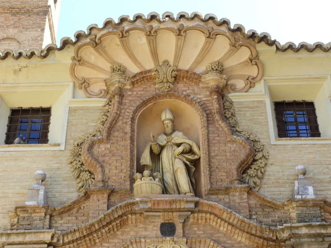 La portada es típicamente barroca, con arco de medio punto, pilastras a los lados y hornacina con la imagen de San Nicolás de Bari sobre la puerta.