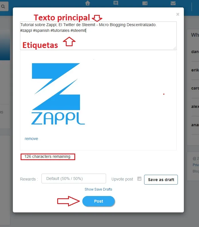 Como pueden observar, escribí de manera breve la información pertinente al tema y además incluí las etiquetas "tags" en la redacción, de esta manera automáticamente Zappl filtrara el contenido en ellas.