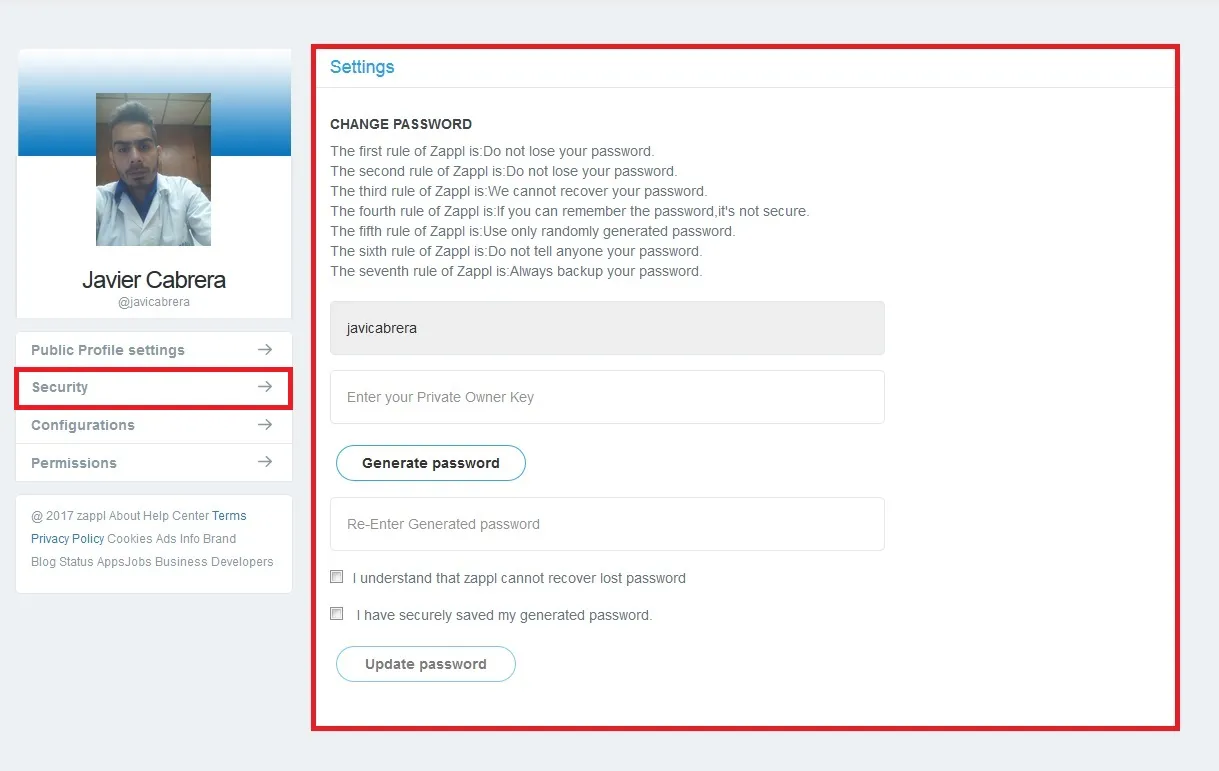 c - Security (Seguridad): Al igual que Steemit, Zappl nos recuerda todos esos consejos de seguridad para el resguardo y cuidado de nuestras contraseñas, así como también la oportunidad de cambiarlas si así queremos.
