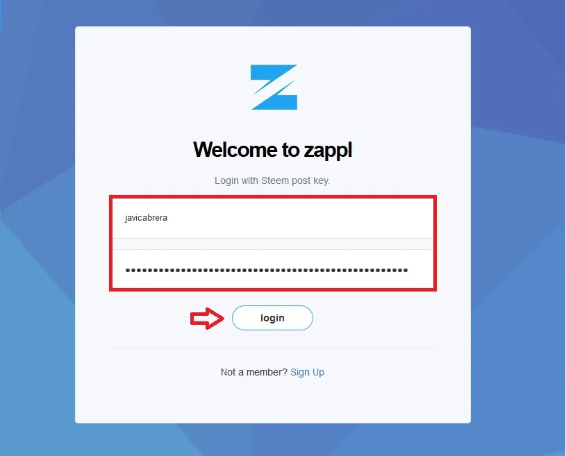 a - Zappl, como toda app creada bajo la blockhain de steem, nos pedirá nuestras credenciales de la plataforma para un enlace correcto y de manera satisfactorio.