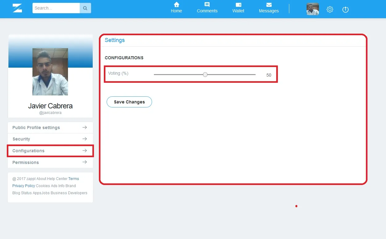 d - Configuración de Voto: Zappl nos permite también, el poder controlar el valor de nuestro voto al recompensar una publicación, de manera fácil y sencilla a través de un escalador de porcentaje.