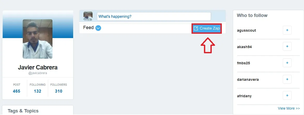 a - Lo primero que debemos hacer es dirigirnos al menú central y darle clic al botón "Create Zap".