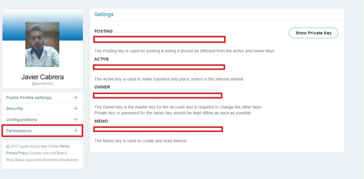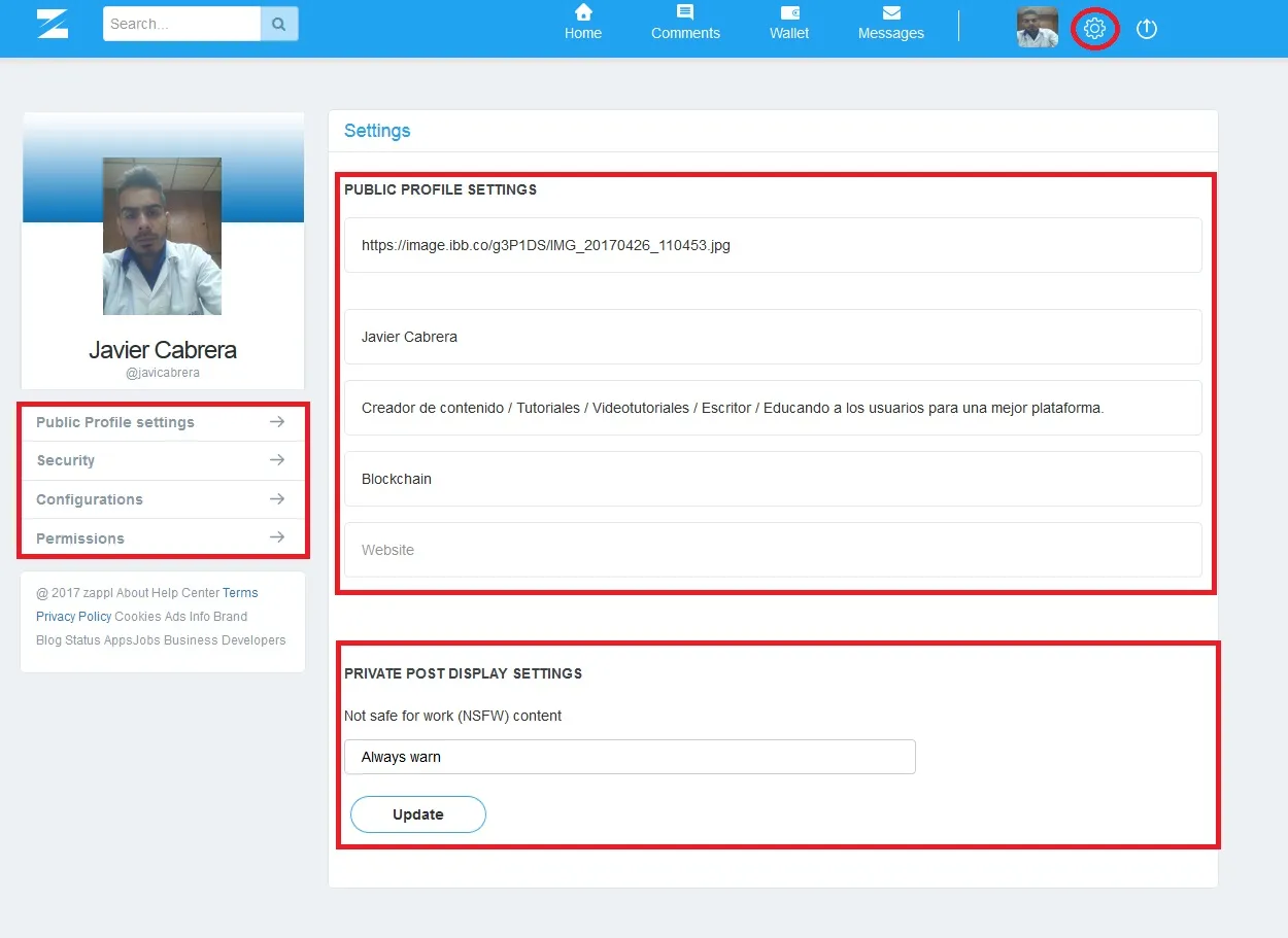 En este apartado nos encontraremos con todas las configuraciones pertinentes a nuestro perfil, Zappl al igual que Steemit, nos permite cambiar desde nuestra imagen principal hasta las claves primarias de la cuenta.