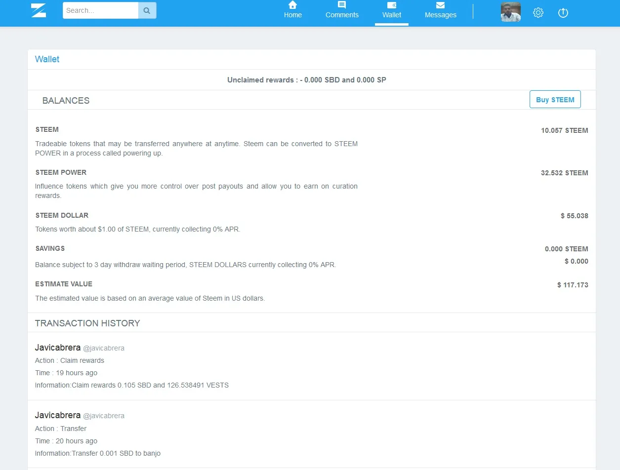 - Botón de Wallet (Billeteta): Este opción nos permite visualizar al igual que steemit, toda la información que tenemos en nuestra billetera, los balances de STEEM, STEEM POWER, STEEM DOLLAR, y todo el record de transacciones que hemos efectuado desde nuestra cuenta.