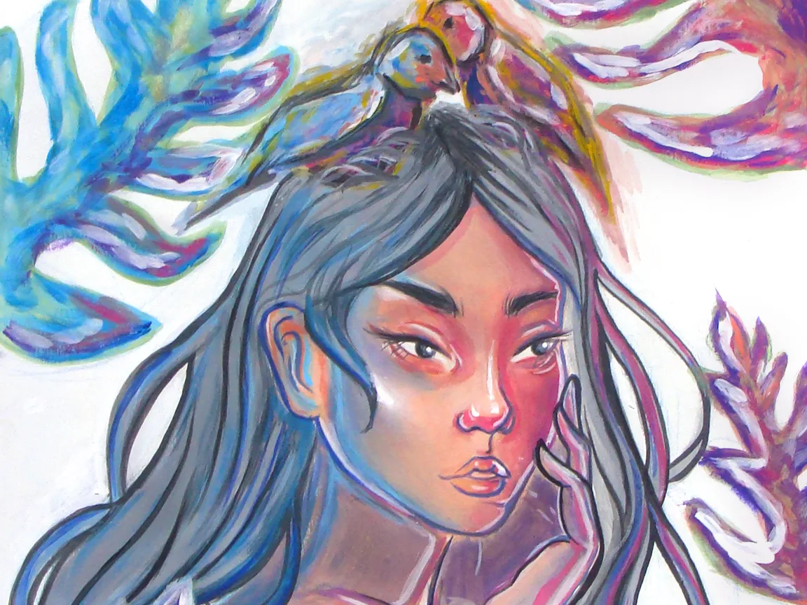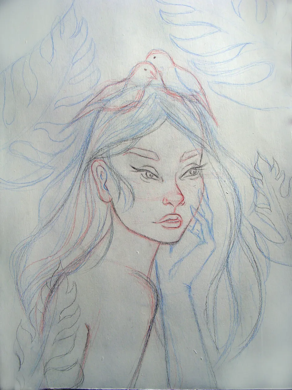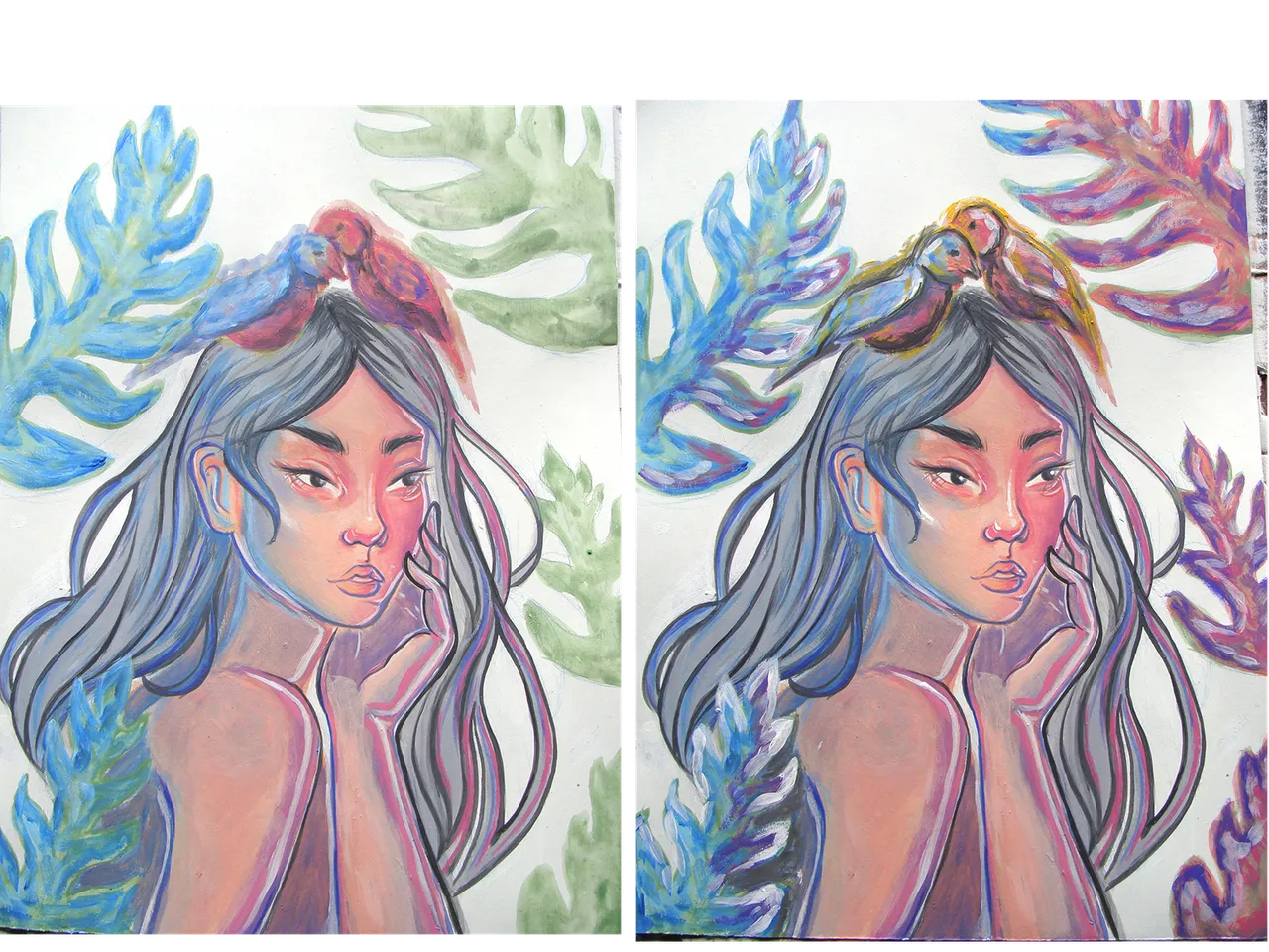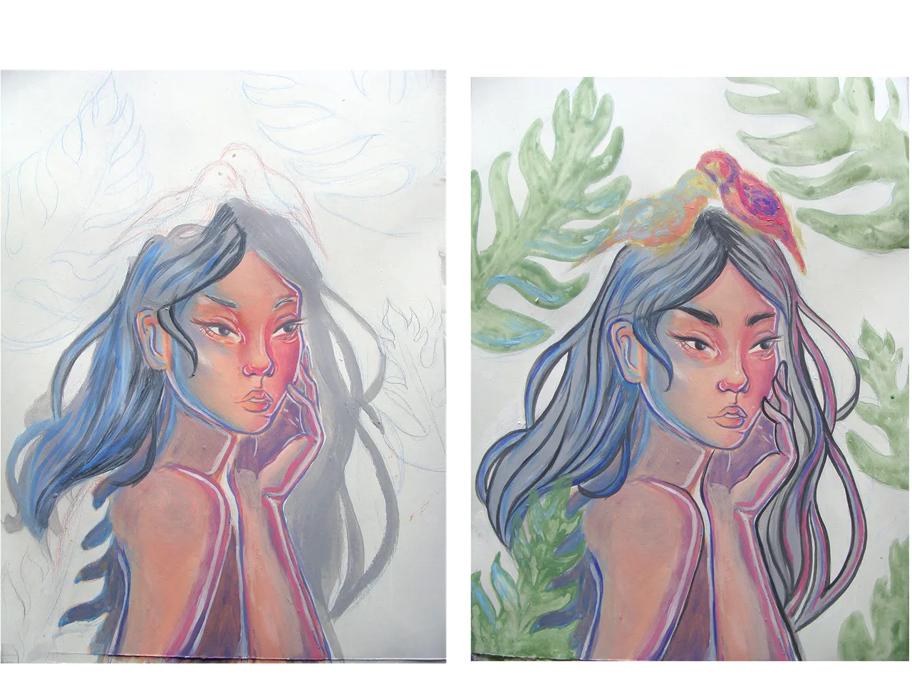 For the hair I gave a general layer in a light gray tone, then add their respective blue and violet lights, darkening and illuminating some areas to give it more movement. Then add a layer through colored spots to make the birds, and diluting the paint in water add a thin layer of green to the leaves that surround it.