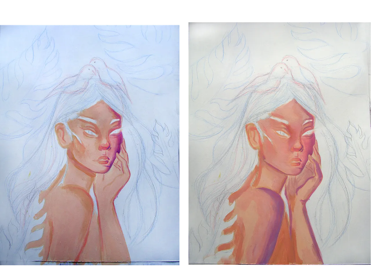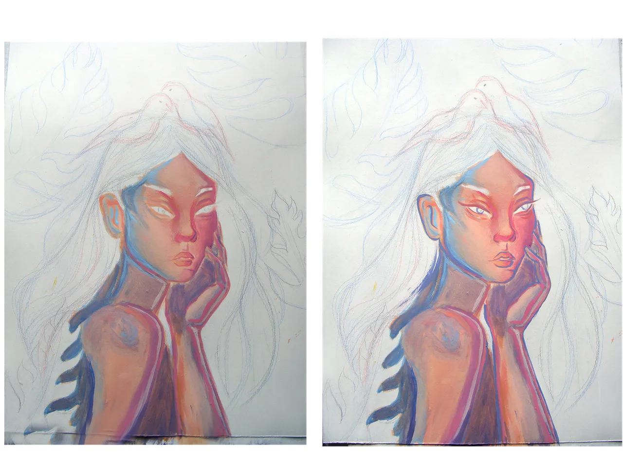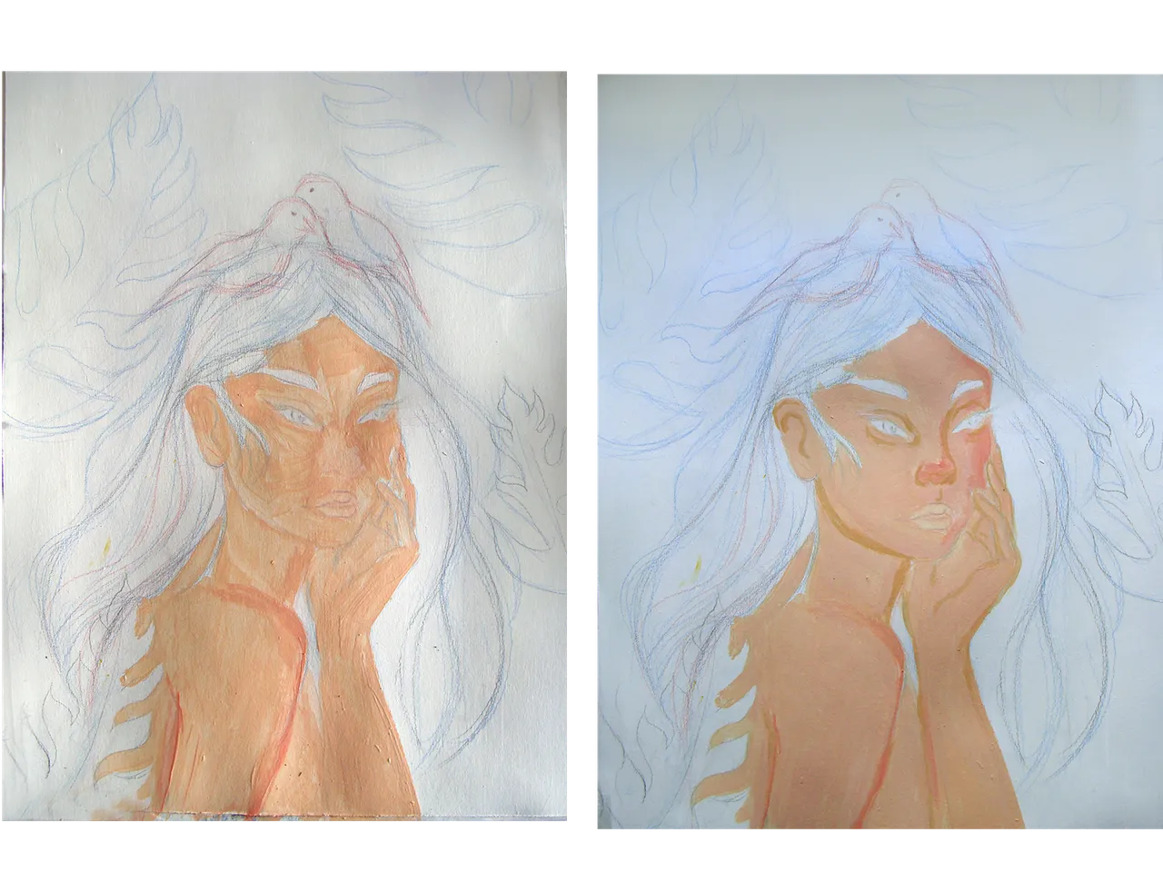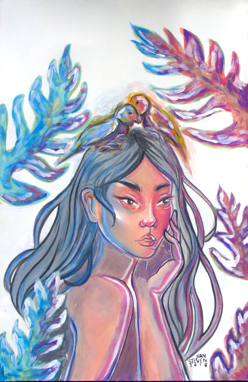 For the hair I gave a general layer in a light gray tone, then add their respective blue and violet lights, darkening and illuminating some areas to give it more movement. Then add a layer through colored spots to make the birds, and diluting the paint in water add a thin layer of green to the leaves that surround it.