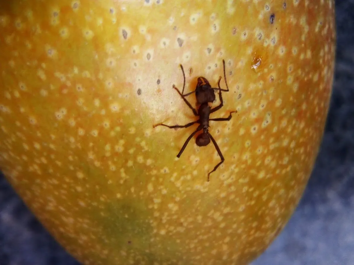 * Bachacos, trabajando afanosamente horadando la piel de los mangos maduros o cortando y llevándose las hojas de las parchitas. Se comieron completica mi más reciente siembra de parchitas, estaban hermosas cuando las transplanté, pero las devoraron de un día para otro, no metafórica sino literalmente hablando.