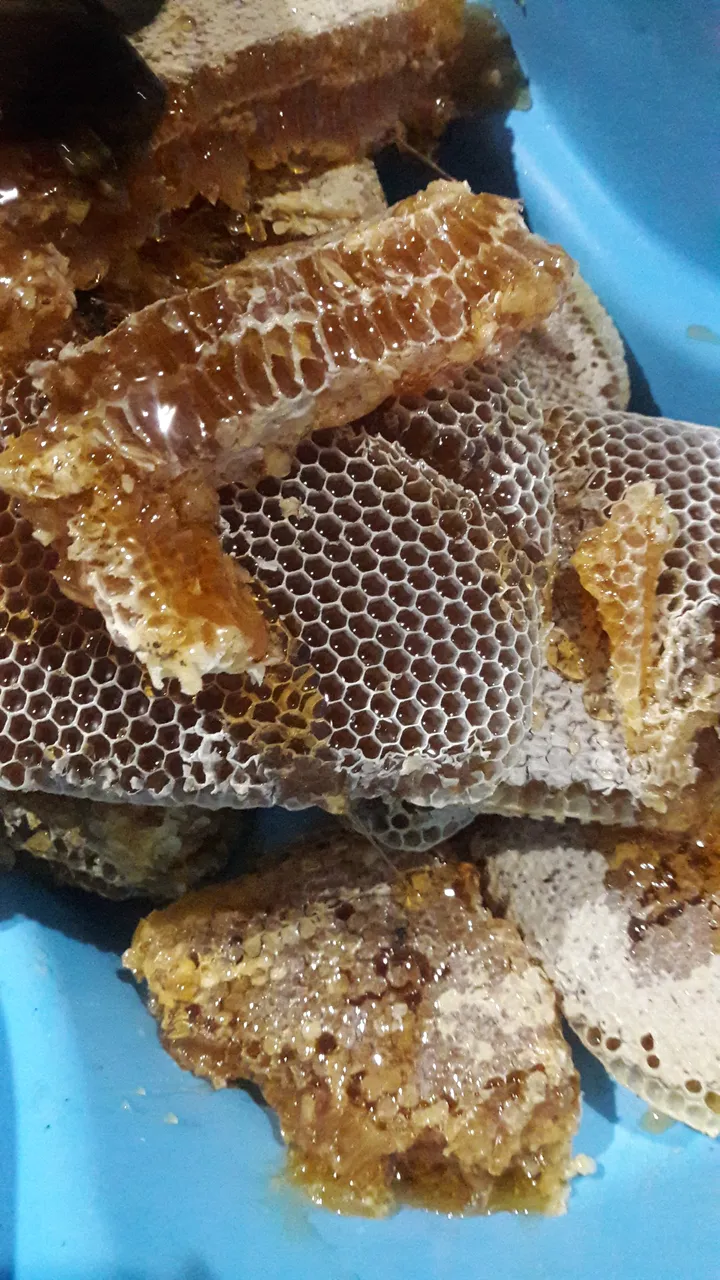 Yo voy a intentar explicarles un poco del proceso de formación y extracción de la miel de abejas, al menos lo que yo entendí del asunto, que la verdad me pareció fascinante. La cuestión comienza cuando las pequeñas abejas "recolectoras", se posan sobre las flores y absorben su néctar, el cual guardan y llevan a su colmena, donde lo entregan a las abejas "obreras" por llamarlas de algún modo; las cuales se encargan de transformalo en miel. En el interior de la colmena, las abejas "obreras" se ponen a trabajar para transformar el néctar en miel, enriqueciendolo con enzimas que ellas mismas segregan, lo cual hace que la humedad dentro de la colmena vaya disminuyendo. Este proceso puede durar varios días, cuando las abejas comprueban que la miel esta lista para ser almacenada, sellan la celda con una fina capa de cera, lo cual es un indicador para los apicultores (personas que recolectan la miel) que la miel esta lista para ser extraida de la colmena. Para extraer la miel, primero hayq eu deshacerse de las abejas, en este caso las ahuyentaron con humo, para luego extraer los panales a los cuales se les va extrayendo la miel poco a poco.