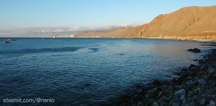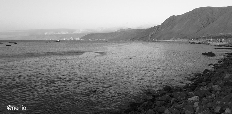 En esta oportunidad muestro otra entrega de mi serie de fotos dedicados al litoral antofagastino, ubicado en el norte de Chile. Esta foto fue tomada cerca de la zona conocida como “Coloso”, en el área hay un pequeño puerto de pescadores y un terminal importante donde se embarcan minerales. Claramente se puede apreciar lo árido de la zona al ver los cerros. Al fondo de la imagen se pueden observar algunas de las edificaciones de la ciudad de Antofagasta.