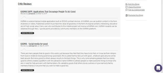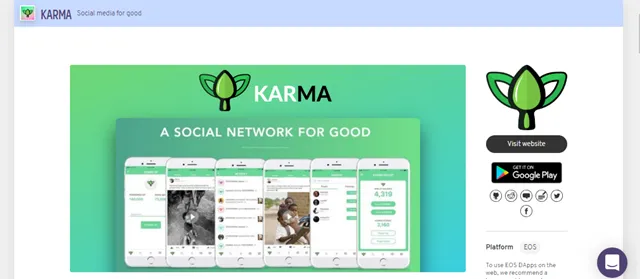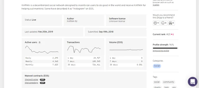 Si hacemos clic en Karma se nos mostrará toda la información que necesitamos saber. De que trata la Dapp, el status de la misma, si está en versión Beta, abierta para el público, etc.