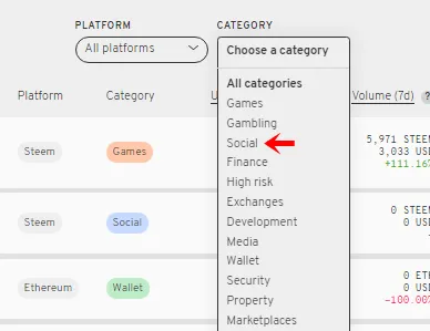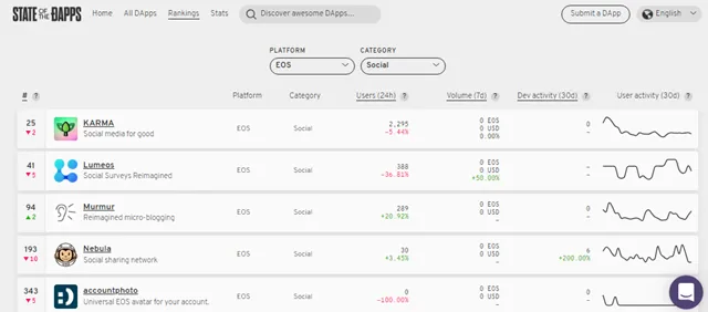 Para este ejemplo elegiremos Social. Y podemos ver que, en State of the DApps, Karma es la aplicación social más popular, siguiéndole Lumeos, luego Murmur y así.