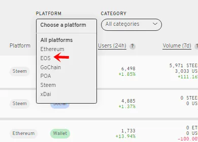 Digamos que quiero ver cuales son las más populares de EOS, simplemente voy a Rankings y hago uso de los filtros. Selecciono la plataforma de EOS y busco la categoría que más me interese.