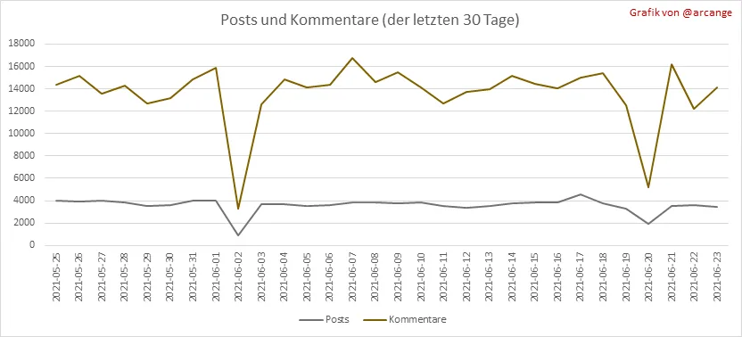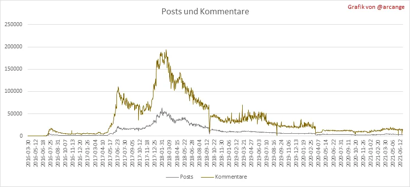 Diese Grafiken zeigen die Entwicklung von Posts und Kommentaren über die gesamte Blockchain-Lebensdauer und der letzten 30 Tage.