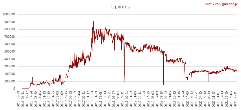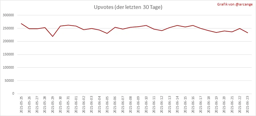 Diese Grafiken zeigen die Entwicklung der Kuration (Upvotes) über die gesamte Blockchain-Lebensdauer und der letzten 30 Tage.