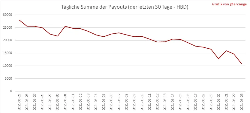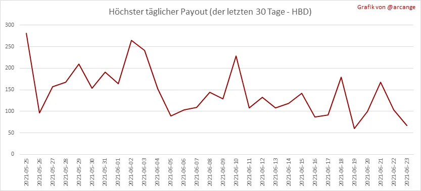 Diese Grafik zeigt den jeweils höchsten Payout, der in den letzten 30 Tagen für einen Beitrag (oder Kommentar) gezahlt wurde.