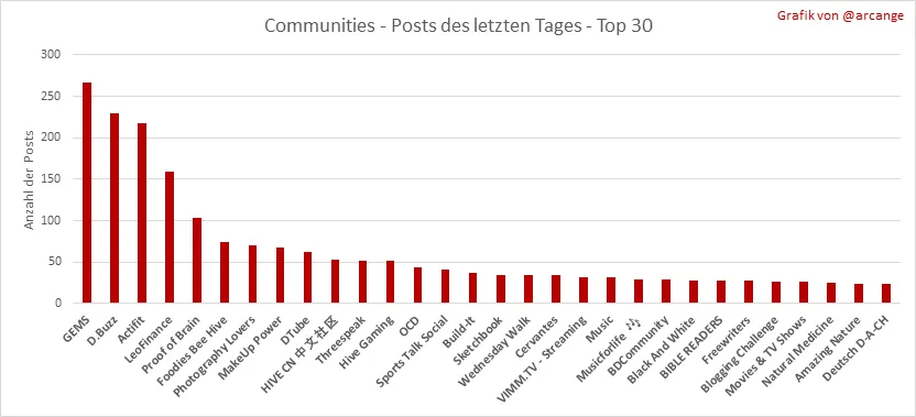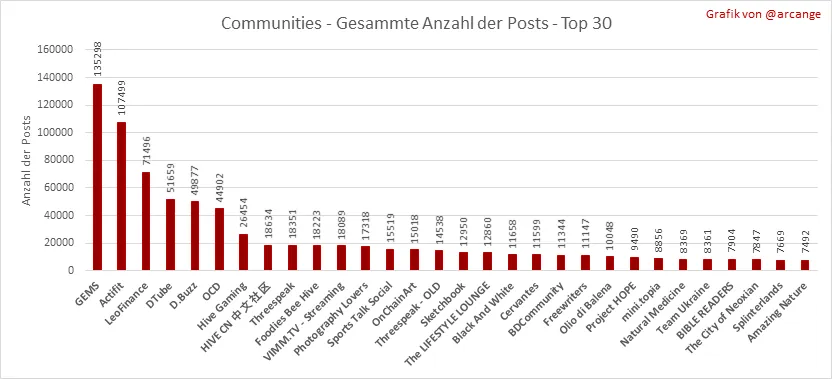 Diese Grafiken zeigen die aktivsten Communitys nach Anzahl der Beiträge (Über die gesamte Blockchain-Lebensdauer und am letzten Tag).