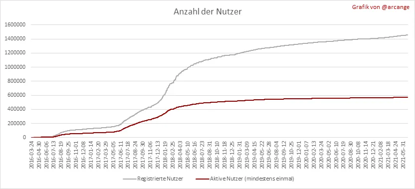 Das letzte Diagramm ist eine monatliche Zusammenfassung der aktiven Benutzer. Vorsicht beim interpretieren vom Wert der letzten Spalte, denn er kann viel niedriger sein, wenn das Monatsende noch nicht erreicht ist.