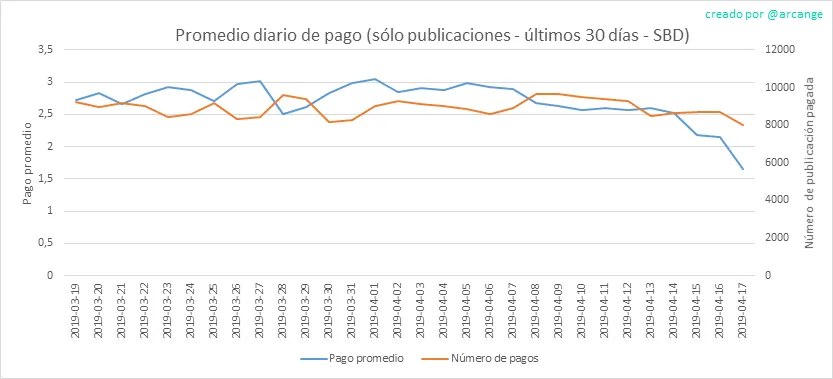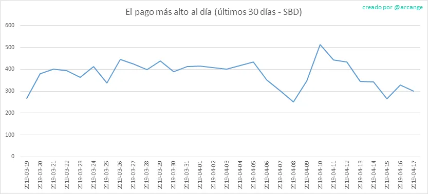 Estos gráficos muestran la recompensa máxima pagada en un post (o comentario) por cada día (duración de bloque completo y los últimos 30 días).