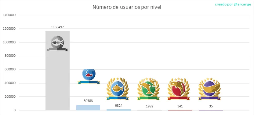 Este gráfico muestra la distribución de la reputación entre los usuarios. Las cuentas con una reputación inferior a 25 se han eliminado para mantener el gráfico legible.