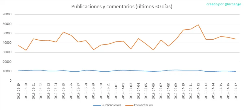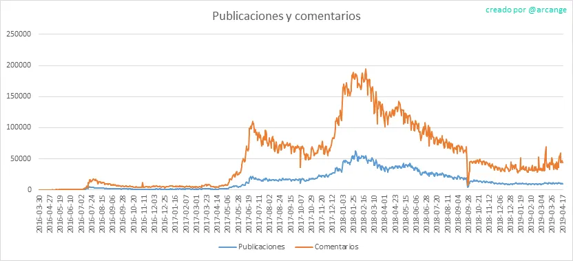 Estos gráficos muestran la evolución de las publicaciones y comentarios por el tiempo de vida útil de la blockchain y durante los últimos 30 días.