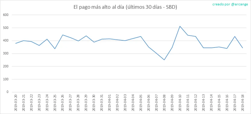 Estos gráficos muestran la recompensa máxima pagada en un post (o comentario) por cada día (duración de bloque completo y los últimos 30 días).